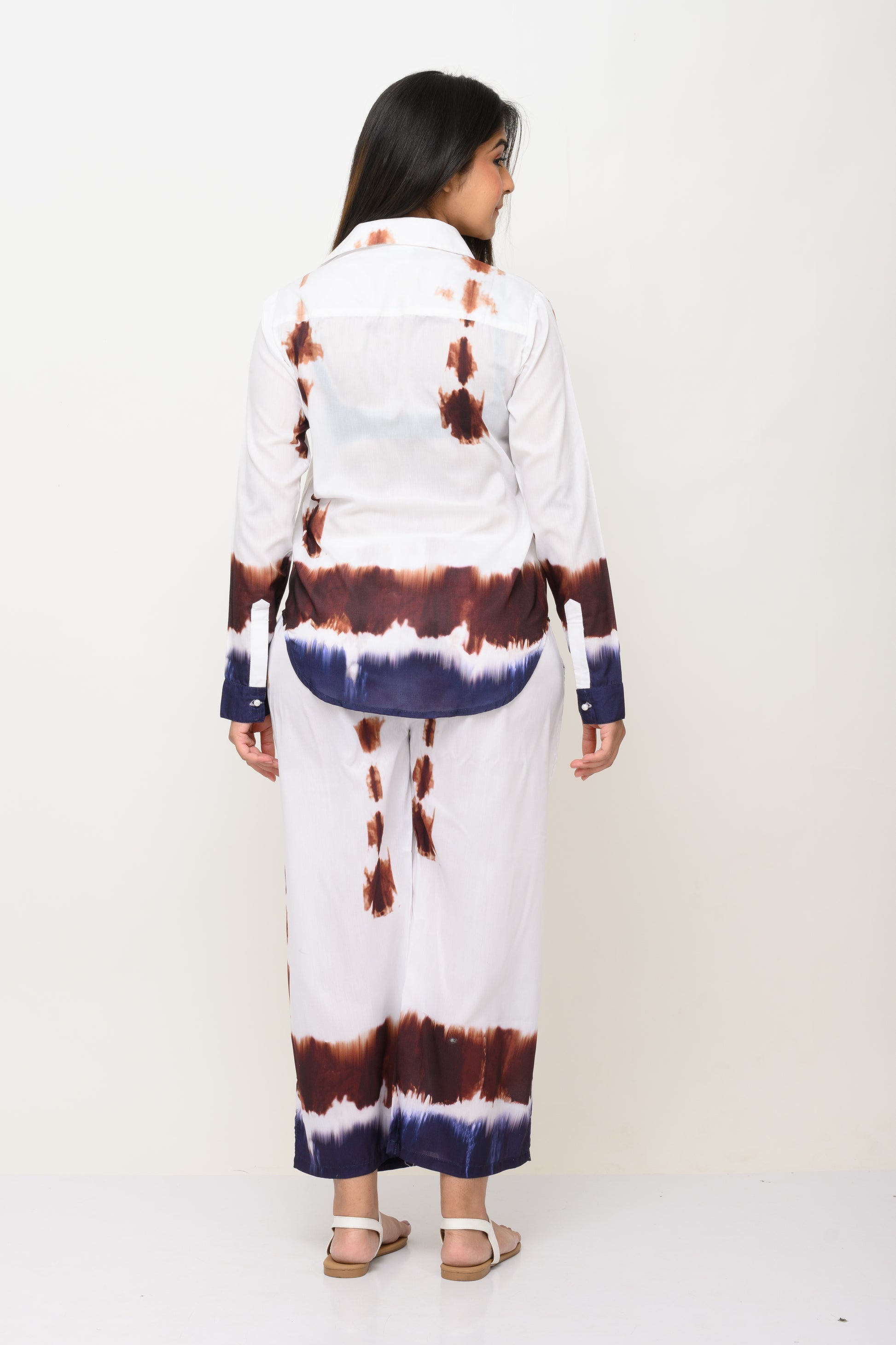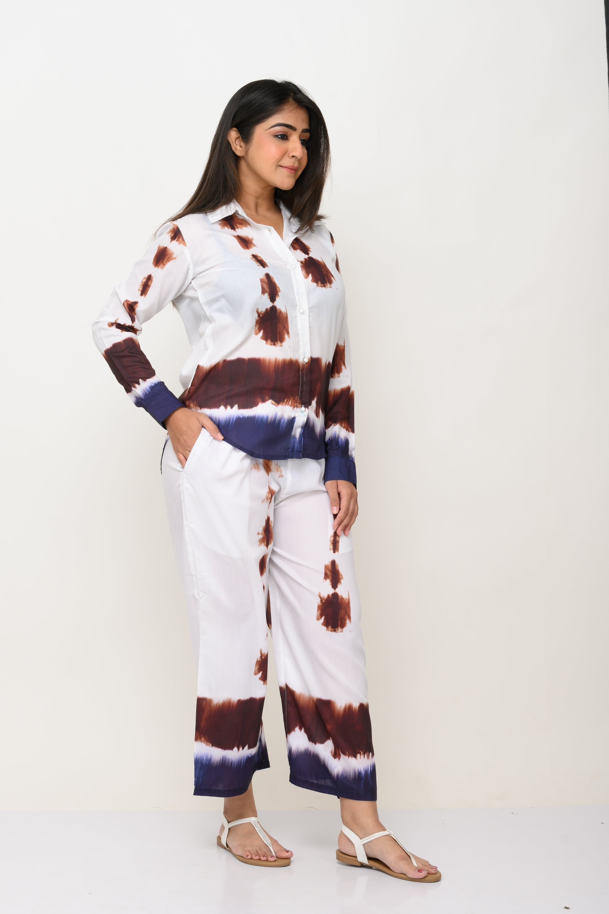 This coordset consists of a shirt and a full length trouser. Made in cotton fabric, the shirt has collars and front buttons. Shirt is full sleeves with cuffed buttons and trousers has back elastic and both sides pocket.